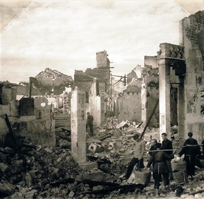 ■1938年12月,老隆遭日寇飞机轰炸后,民居与店铺的残垣断壁。摄于1881年至1910年期间。原图现藏美国南加州大学。